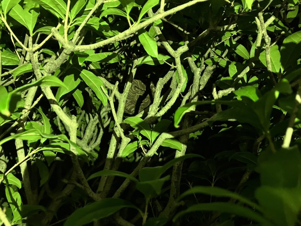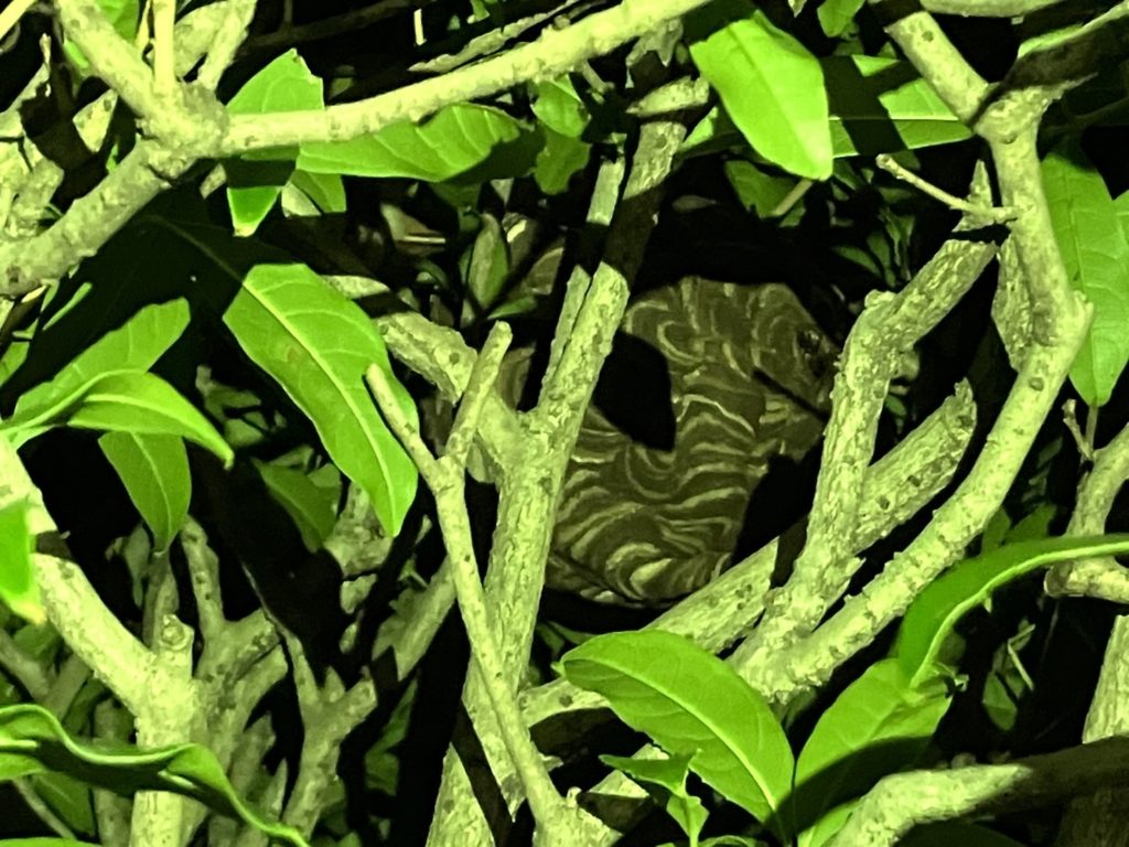 庭の木の中にスズメバチの巣があり、かなり凝視しないと発見が難しい状況でした。
