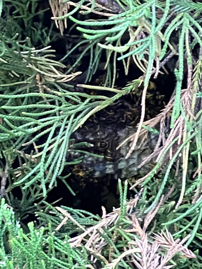 1枚目の写真 中央やや上の部分をアップにしてみました。なんとなく蜂の巣が隠れているのがわかりますか??